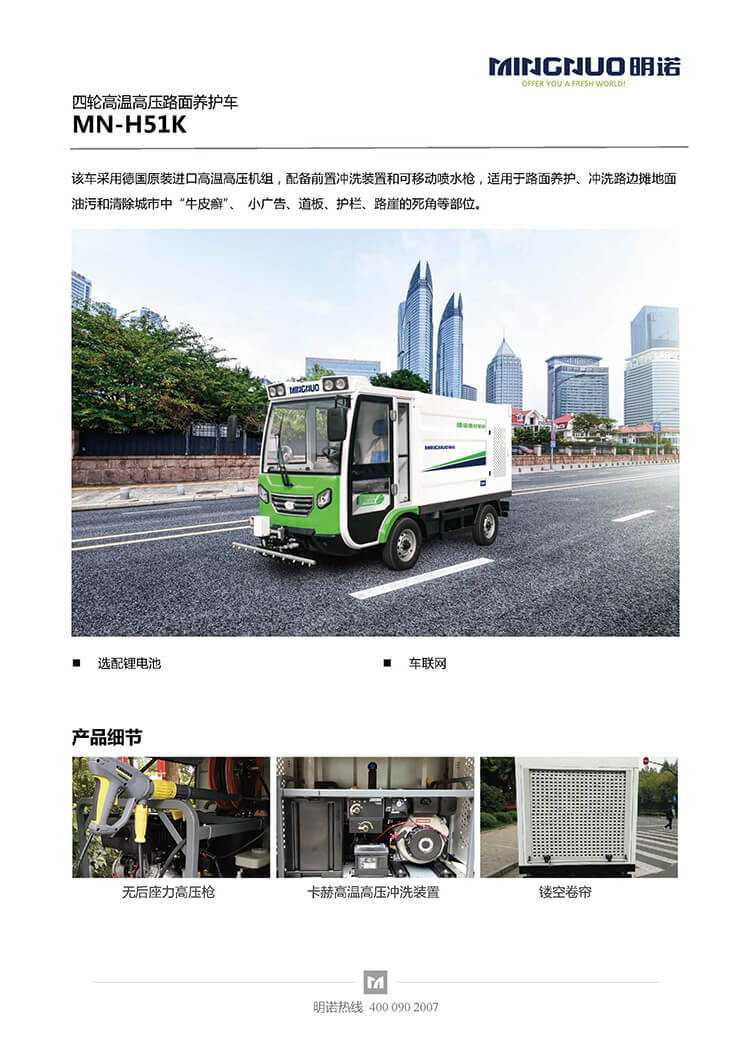 四輪高溫高壓養護車采用德國原裝進口高溫高壓機組,配備前置沖洗裝置和可移動噴水槍,適用于路面養護、沖洗路邊攤地面油污和清除城市中“牛皮癬”、 小廣告、道板、護欄、路崖的死角等部位。