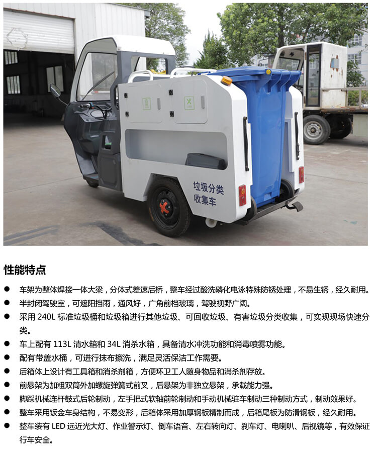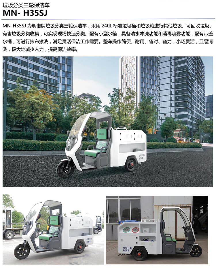 新三協垃圾分類三輪單桶保潔車,采用240L標準垃圾桶和垃圾箱進行其他垃圾、可回收垃圾、有害垃圾分類收集,可實現現場快速分類。配有小型水箱,具備清水沖洗功能和消毒噴霧功能,滿足靈活保潔工作需要。整車操作簡便、耐用、省時、省力,小巧靈活,且易清洗,極大地減少人力,提高保潔效率。
