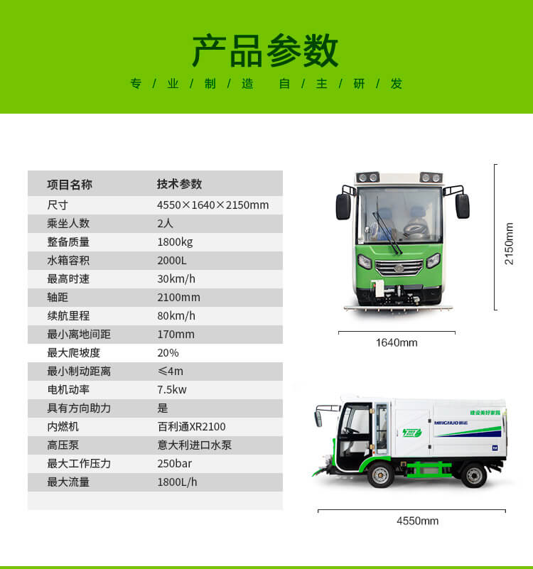 該車配備前置沖洗裝置和可移動噴水槍,可用于路面養(yǎng)護(hù)、地面清潔、植被清潔澆灌、建筑物雕像清潔等,也可用于消毒和噴灑農(nóng)藥。適用于路面養(yǎng)護(hù)、沖洗路邊攤地面油污和清除城市中“牛皮癬”、 小廣告、道板、護(hù)欄、路崖的死角等部位。